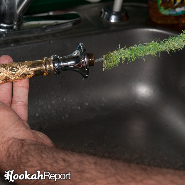 Next, with the open end of the stem in the sink, use the soft bristled hookah brush to scrub the inside of the stem. Do this by pushing the brush in and out of the stem aggressively. If your hookah stem is too long for the brush, turn the stem over and force the brush through the other end as well.