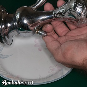 Start by carefully removing the purge valve cap on your stem. It’s best to do this over a plate or a bowl because the ball bearing inside the valve is going to fall out. If you lose the ball bearing and don’t have a replacement, the hookah cannot be used until the valve is plugged with something. So do this carefully!