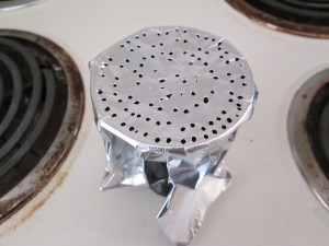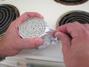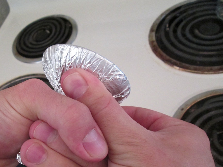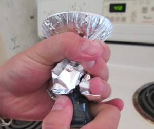 Now, put your delicate hands on. At this point, you want to pull the foil tight and re-foil the bowl. While placing the foil, keep in mind the shape of cupcake liners. The cupcakes liners are flat pieces of paper that have been crimped to make a cup shape. You want to replicate that crimped style in order to get your flat piece of foil to fit over the bowl.