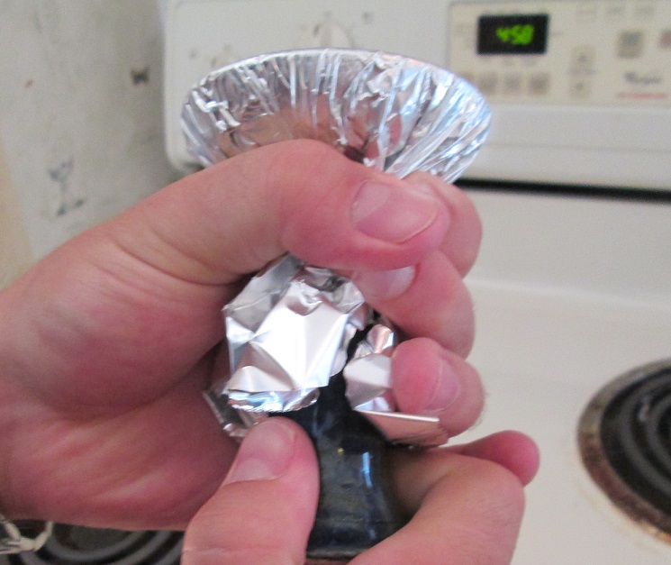 Once you have done all of these steps, you can check to see if you did the job correctly. Press your lips up to the bottom of the bowl as if you are going to play it like a trumpet. Quickly and lightly puff in and out. If you hear the foil flapping in the wind, the foil is not as tight as it should be.